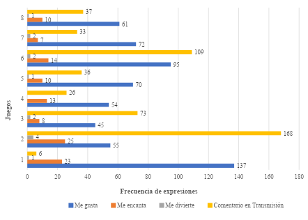 En la figura 3 se muestran las frecuencias de las expresiones cuando el equipo empató en ocho ocasiones, registrando 168 comentarios durante la transmisión en el juego 2 vs. el Deportivo Teziutlán del torneo de la UPSL, así como 137 expresiones de “Me Gusta” en el juego 1 vs. Cerveceros de Tuxtepec del torneo de la UPSL.