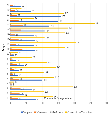 El análisis de los resultados del equipo Atlético FEFUV muestra la frecuencia de expresiones cuando se pierde, empata y gana. La figura 2 muestra las frecuencias obtenidas en 20 juegos, apareciendo en el partido 16 vs. Toros de Veracruz en la ronda de cuartos de final de la SLMX-I el mayor número de comentarios en la transmisión con un total de 264, y en el juego 18 vs. Toros de Veracruz aparecen 157 “Me Gusta”.