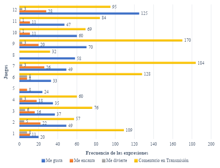 En la figura 4 se muestran las frecuencias de las expresiones cuando el equipo ganó en 12 ocasiones, registrando 184 comentarios durante la transmisión en el juego 7 vs. Bravos de Tehuacán de la SLMX, así como 125 expresiones de “Me Gusta” en el juego 12. vs Indios de Karla Rico de la SLMX.